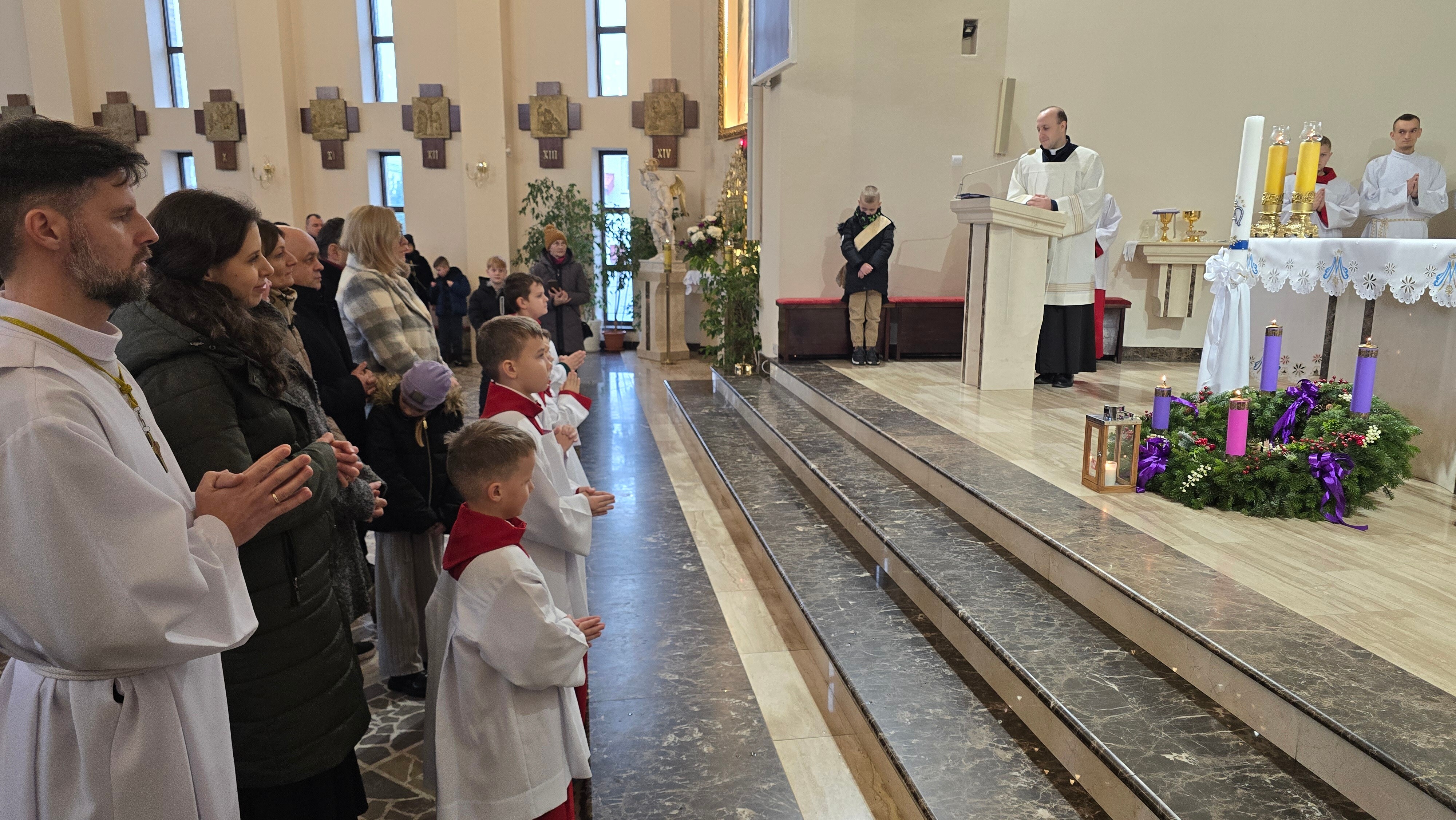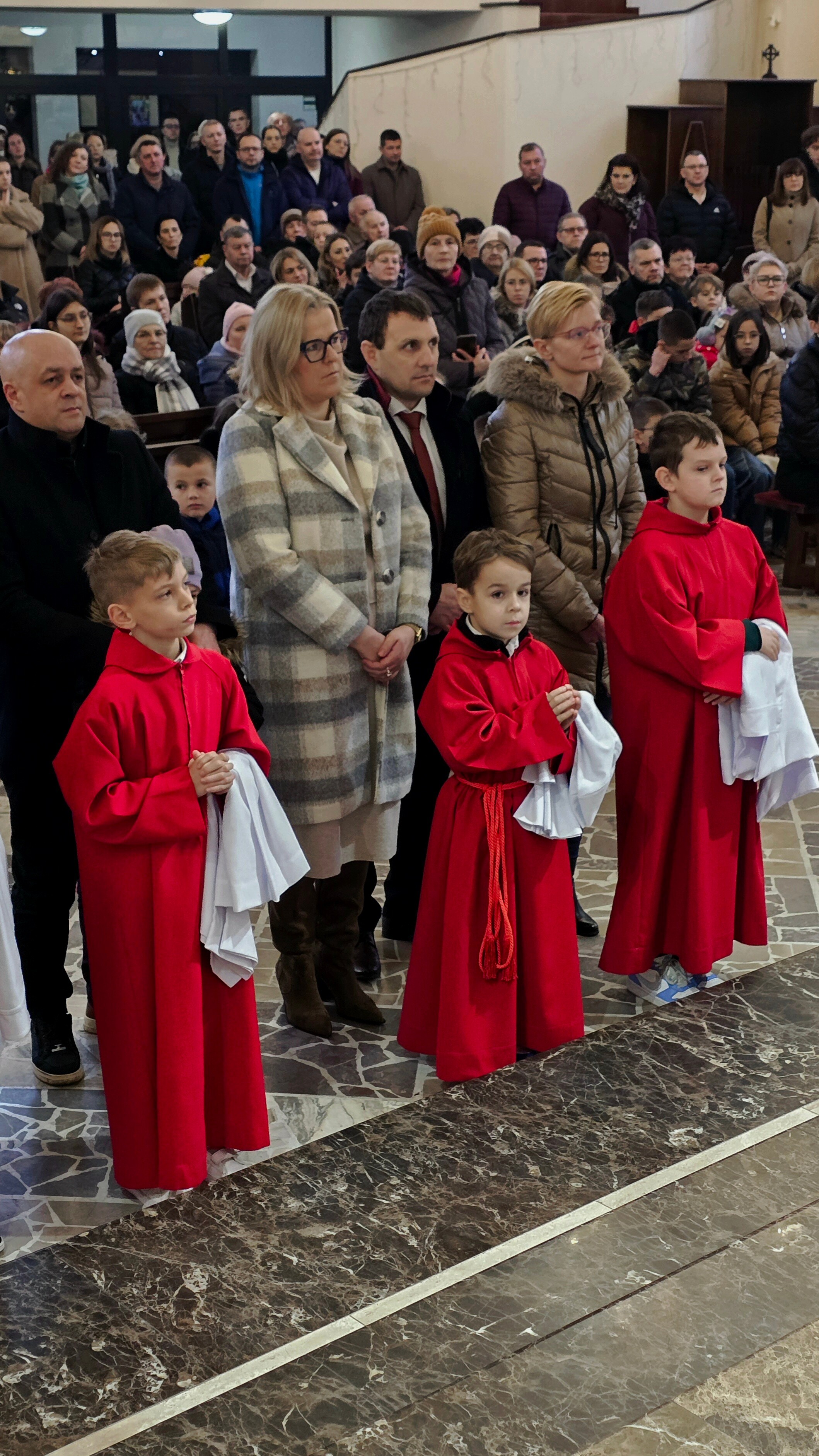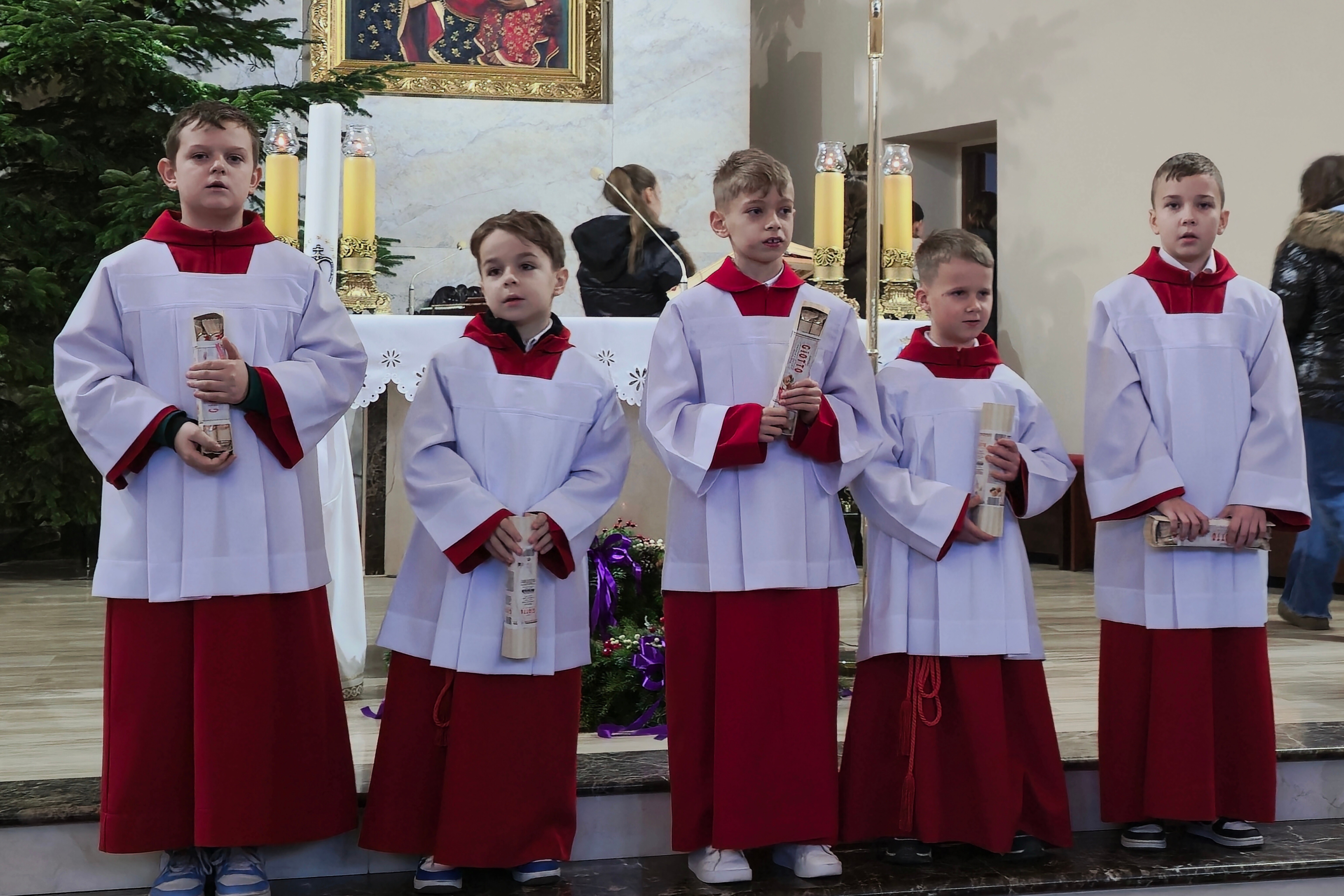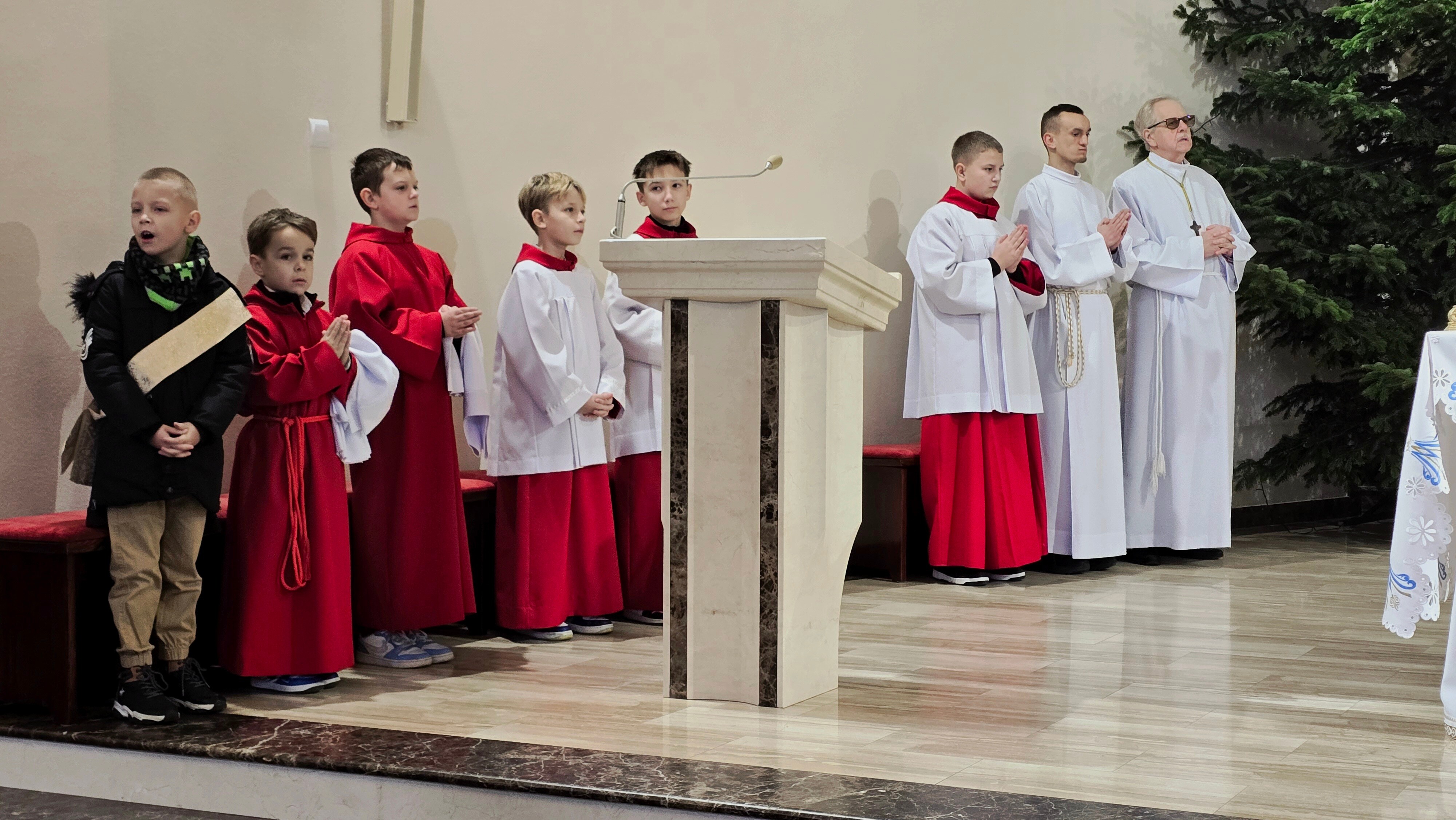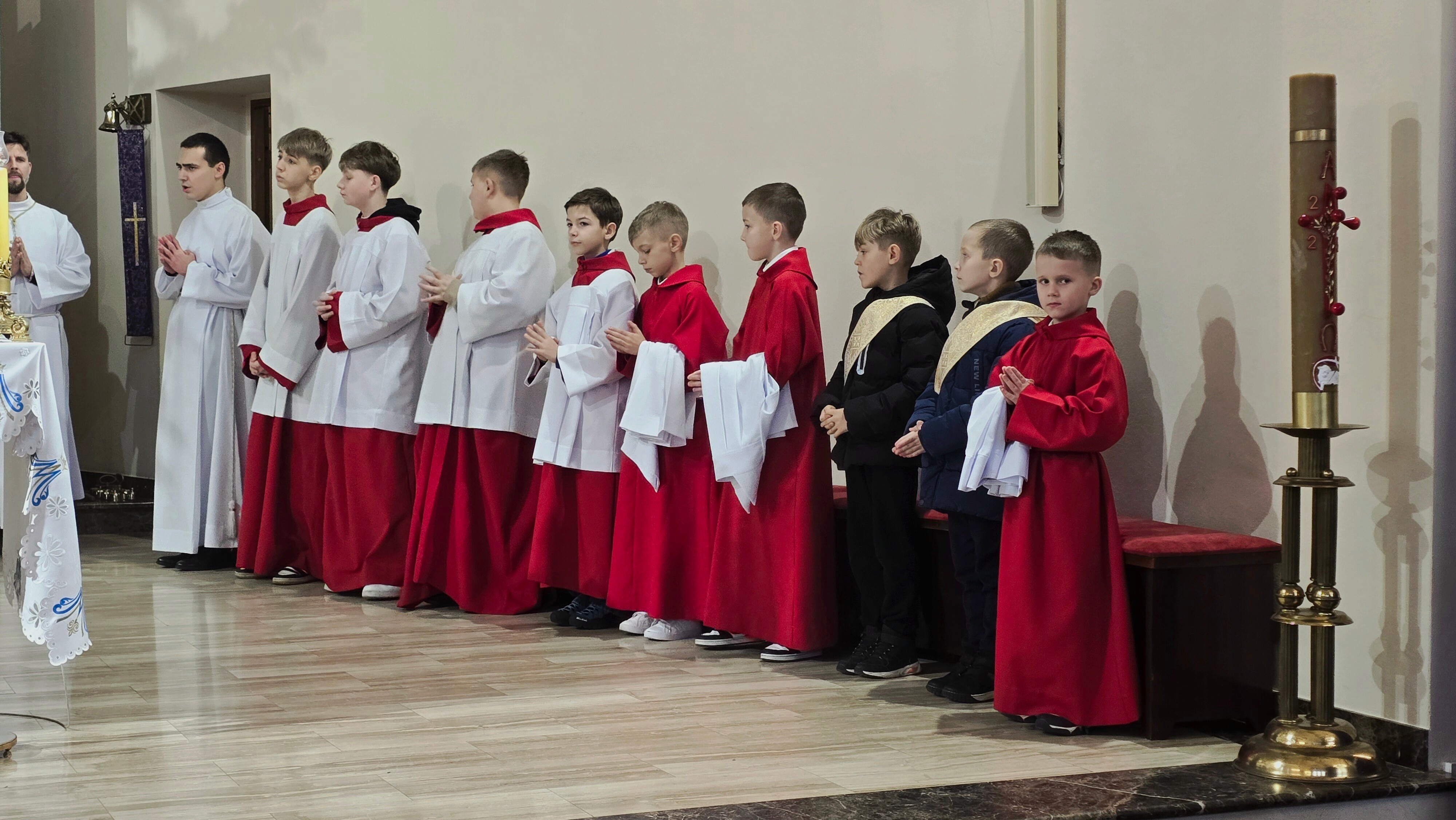 Podczas uroczystej Mszy Świętej pięcioro chłopców, przygotowywanych przez ks. Dominika Stempina, została oficjalnie przyjęta do grona ministrantów. W trakcie liturgii kandydaci po raz pierwszy przywdziali szaty ministranckie, które zostały uroczyście poświęcone przez ks. proboszcza Władysława Waszaka. Ten wymowny znak stał się nie tylko widzialnym potwierdzeniem rozpoczęcia ich służby przy ołtarzu, lecz także symbolem gotowości do podejmowania nowych obowiązków i odpowiedzialności wynikających z posługi liturgicznej.